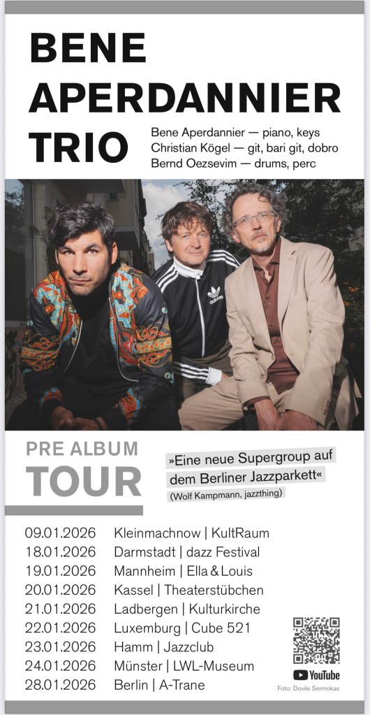This concert will be followed by the first tour of Bene Aperdannier Trio, 9 dates in January, followed by the recording session for the upcoming album at Hansa Studios Berlin at the end of the month, stay tuned!